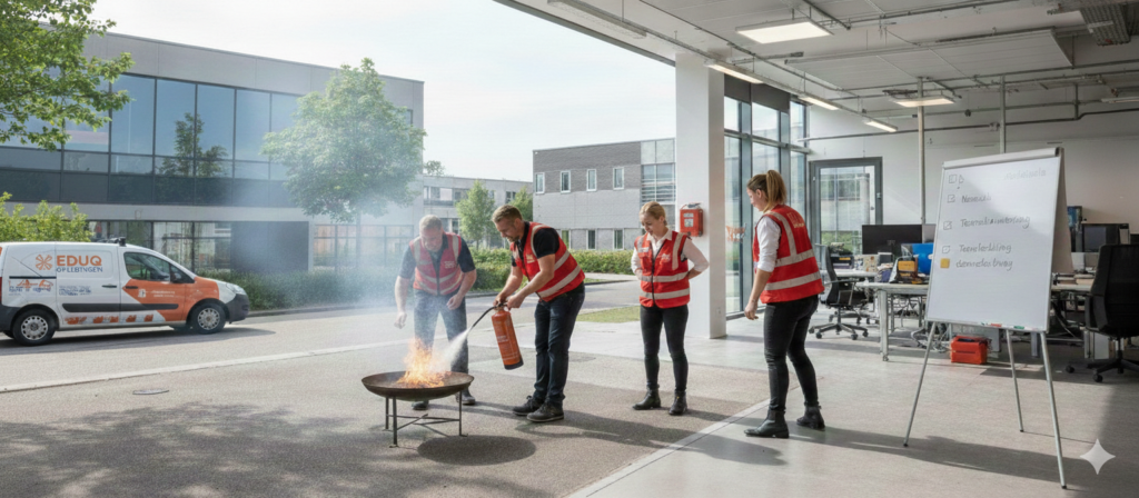 Bij een incompany traject vindt de volledige cursus — zowel de theorie als de praktijk — plaats op jouw eigen bedrijfslocatie. Het grote voordeel hiervan is de context. Onze instructeurs passen het programma namelijk aan op de specifieke risico’s van jouw pand en sector. Of het nu gaat om een complexe productiehal met gevaarlijke stoffen of een moderne kantoortuin; de training is altijd relevant.